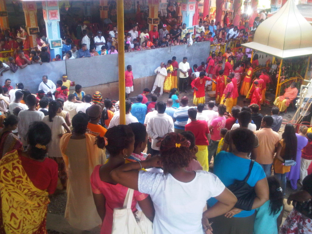 Le lendemain, jour de Noël, notre tournée des cérémonies bizarres culmine dans le sud de l’île, à Camp Diable, au milieu d’un champ de canne à sucre dont on nous a indiqué l’emplacement approximatif. Des dizaines de voitures garées, le son des tambours et des gens habillés de safran et jaune nous mettent sur la piste du temple Amma Tookay. C’est ici qu’a lieu la cérémonie tamoule de la Marche sur le feu, un autre rituel qui, vu de loin, fascine et dérange.