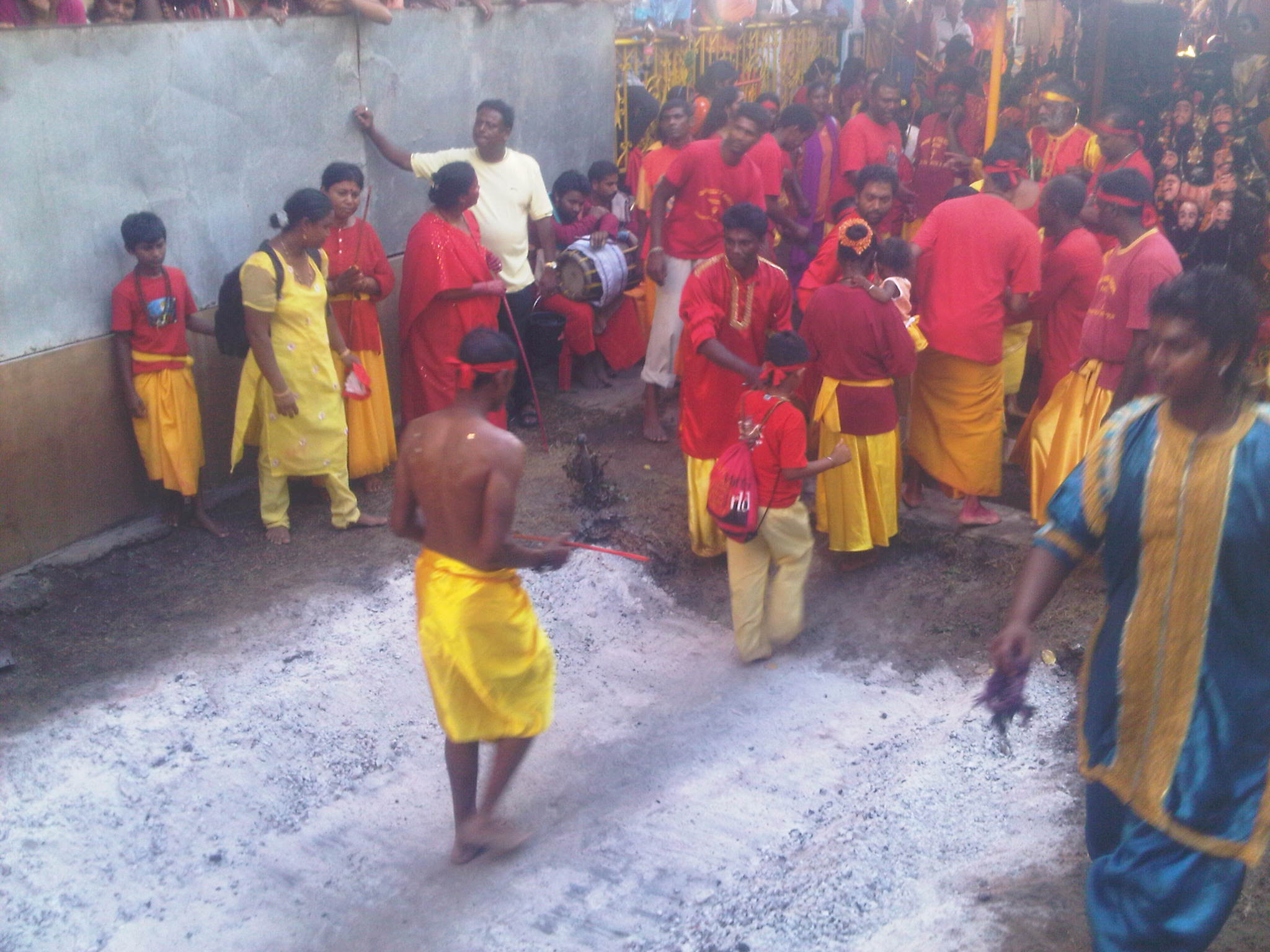 A l’entrée, notre premier choc : comme chez les chiites, des vendeurs ambulants offrent… le popcorn et la barbe à papa ! Un peu plus loin, à l’extérieur du temple décoré de figures humaines et animales aux couleurs bonbons, des croyants forment un long cortège qui avance vers le lieu de la cérémonie, une courte allée de cendres encore fumantes au milieu de spectateurs impassibles.