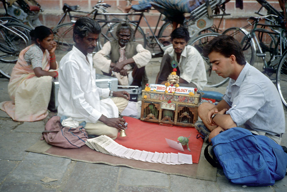 La scène se passe sur un trottoir de New Delhi, le jour de mes 26 ans. Cet homme offre des séances d’ ‘astrologie des oiseaux’ aux passants. Il étale un jeu de cartes par terre, agite une clochette et ouvre une porte de la cage des perroquets. Un oiseau sort, se dandine jusqu’au jeu de cartes et en choisit une d’un coup de bec énergique.